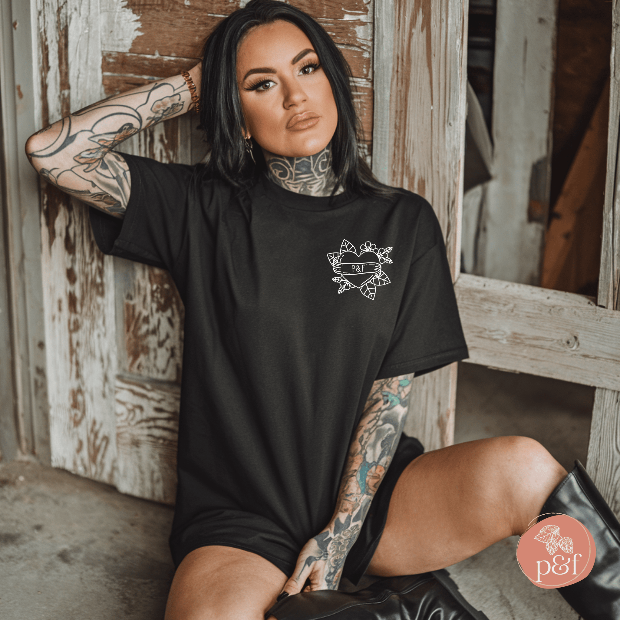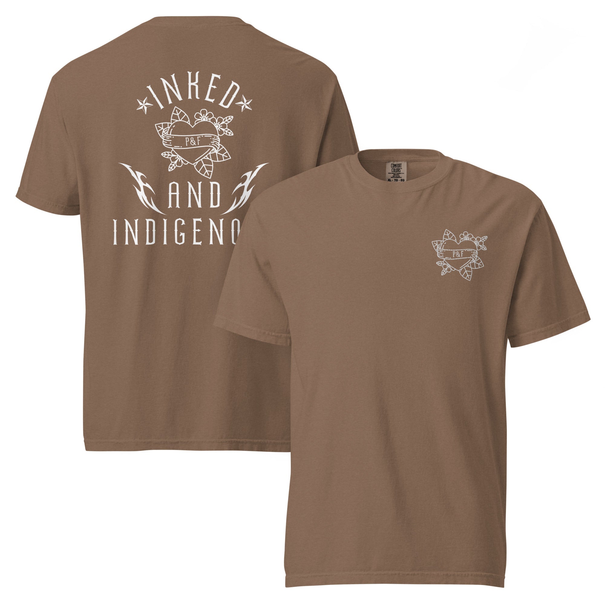 This design features a classic tattoo-style heart on the front with “P&F” for Paperbacks & Frybread, honoring our indie bookstore roots, while the statement “Inked & Indigenous” celebrates Indigenous identity, creativity, and resistance.